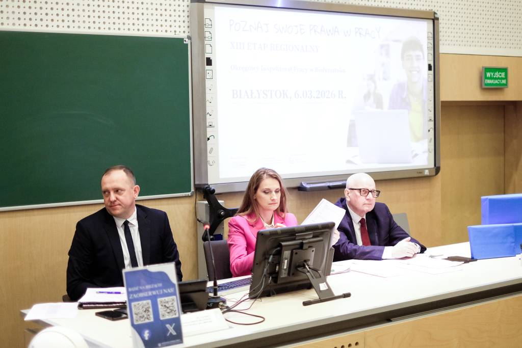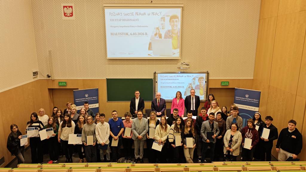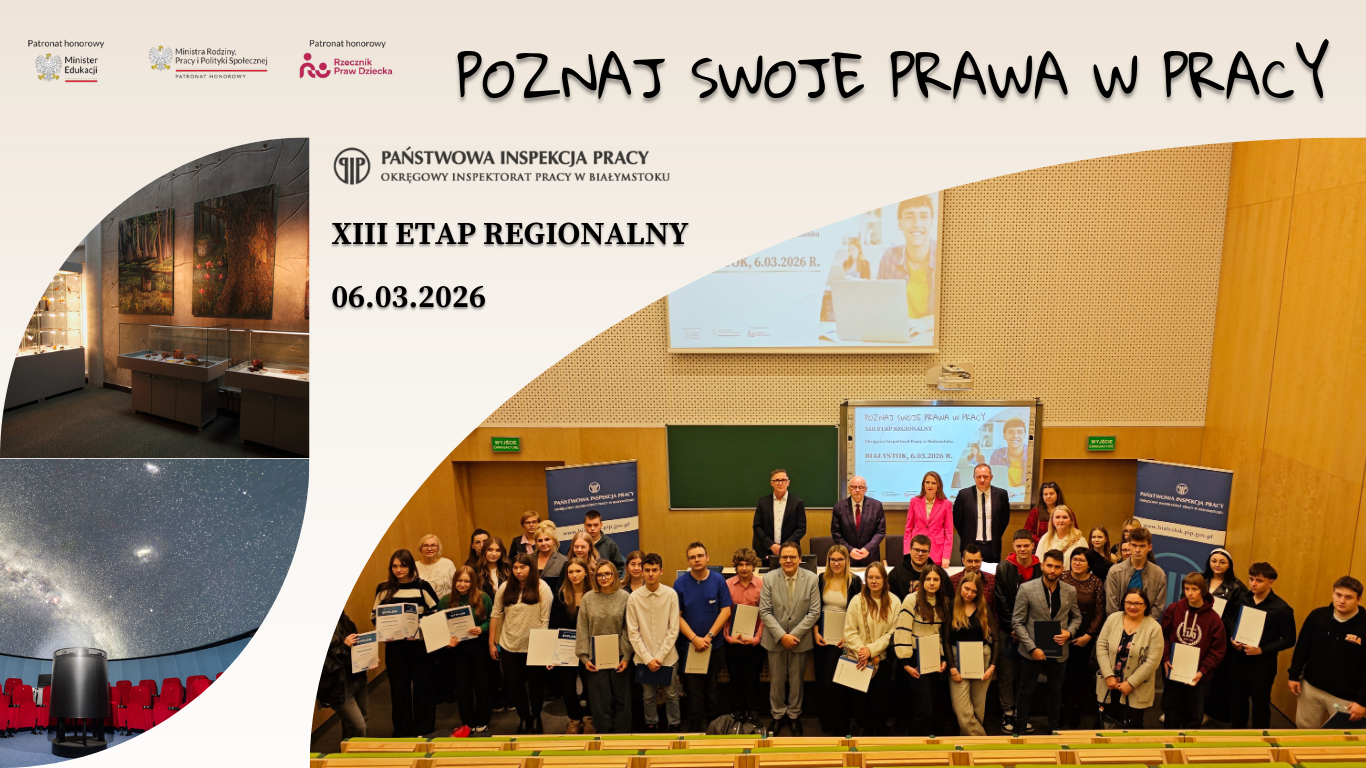6 marca 2026 roku na Kampusie Uniwersytetu w Białymstoku odbył się etap regionalny XIII edycji ogólnopolskiego konkursu "Poznaj swoje prawa w pracy", którego celem jest popularyzowanie wśród uczniów szkół ponadpodstawowych wiedzy dotyczącej ochrony pracy, bezpieczeństwa i higieny pracy, legalności zatrudnienia oraz innej pracy zarobkowej. Konkurs został zrealizowany we współpracy z Uniwersytetem w Białymstoku pod honorowym patronatem Ministry Edukacji, Ministry Rodziny, Pracy i Polityki Społecznej oraz Rzecznika Praw Dziecka.