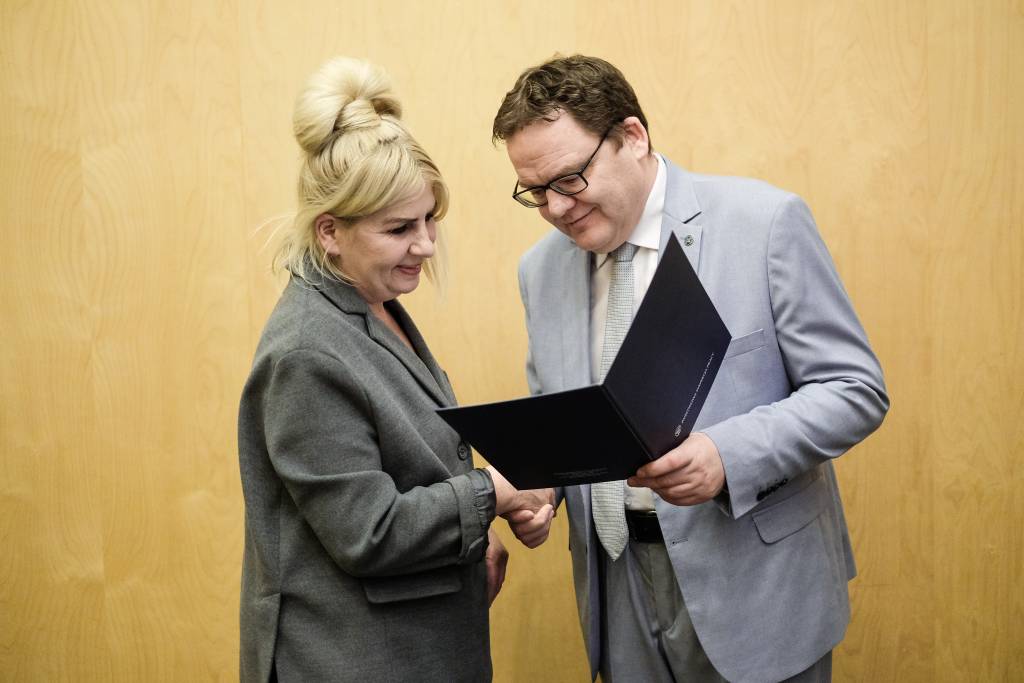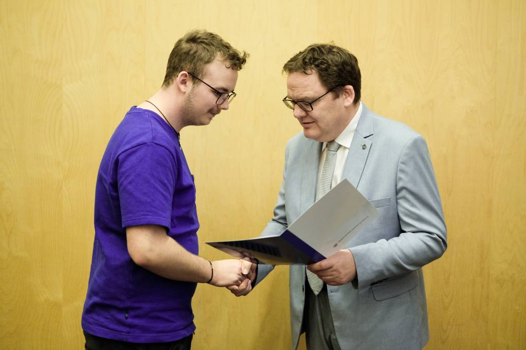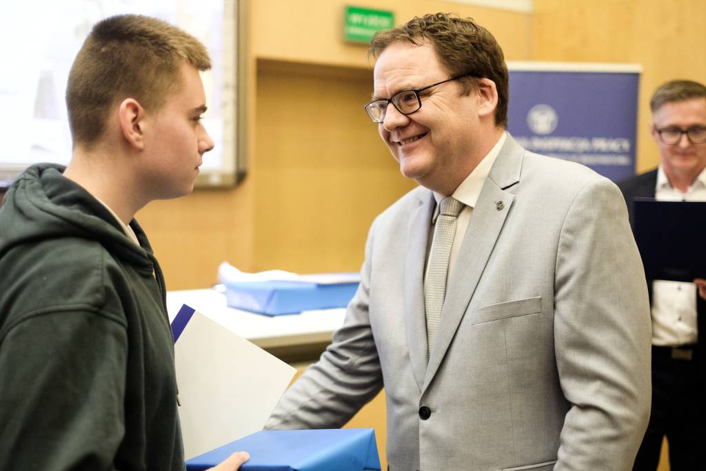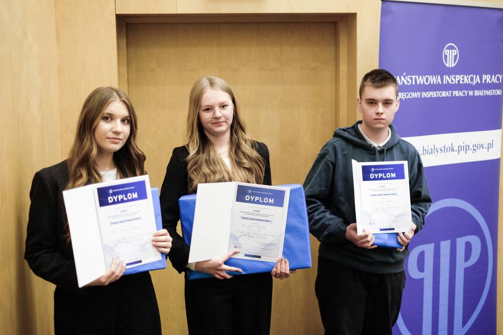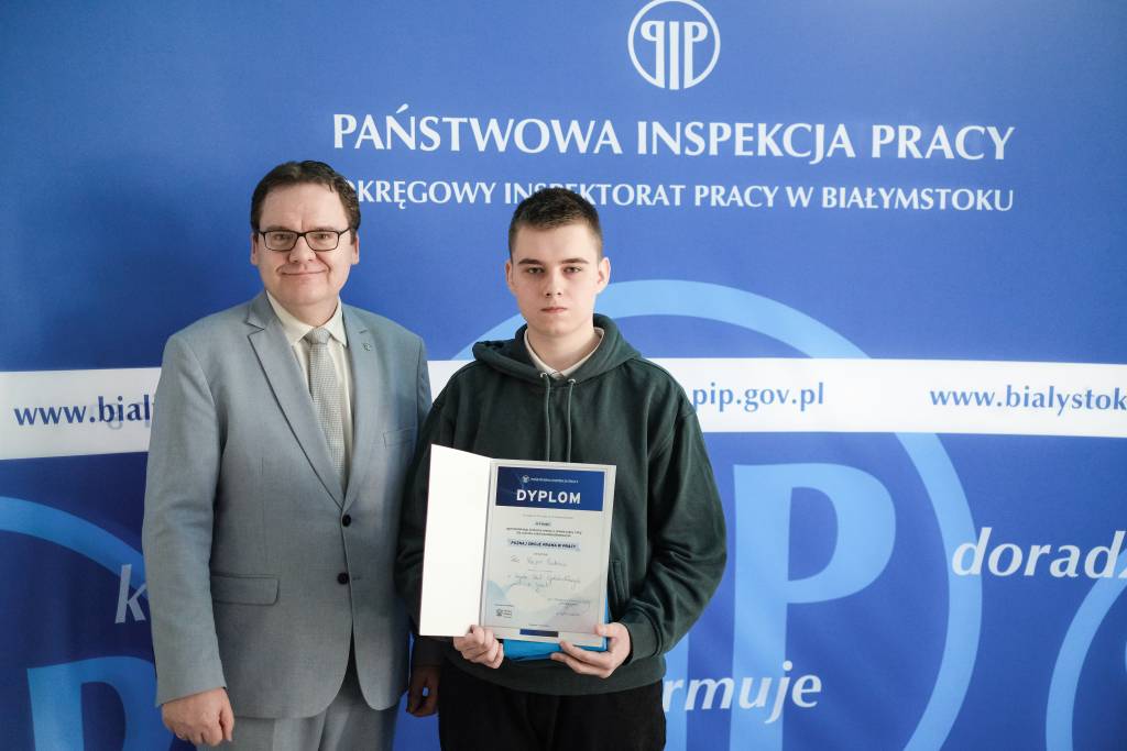 Dr Karol Łapiński, p.o. Okręgowy Inspektor Pracy w Białymstoku wręczył dyplomy gratulacyjne wszystkim uczniom i ich nauczycielom uczestniczącym w etapie regionalnym konkursu. Wyraził przy tym podziękowania za wysoki poziom wiedzy oraz świadomości nt. przepisów prawa pracy oraz bezpieczeństwa i higieny pracy wśród młodzieży szkolnej.
