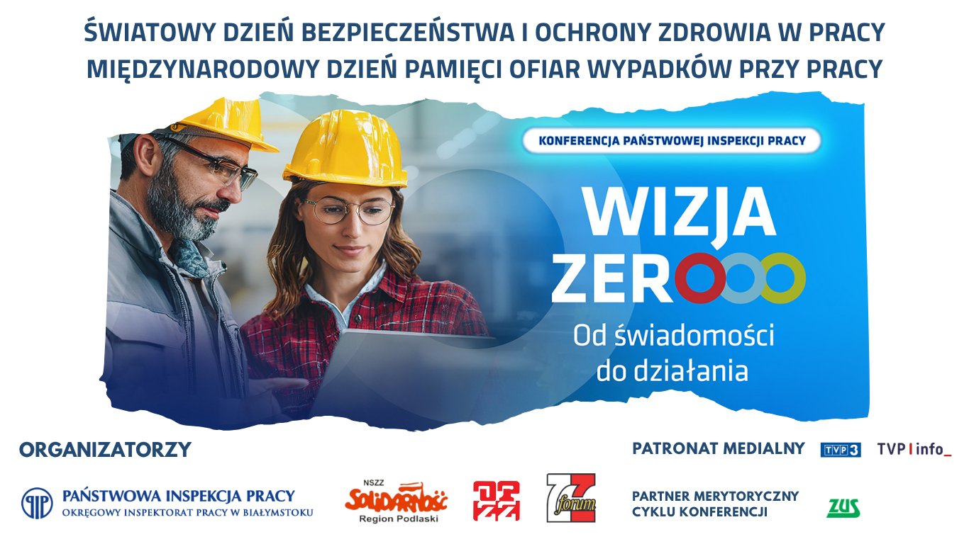 Okręgowy Inspektorat Pracy w Białymstoku we współpracy z reprezentatywnymi organizacjami związkowymi tj. NSZZ „Solidarność” Region Podlaski, Rada OPZZ Województwa Podlaskiego oraz Zarząd Wojewódzki FZZ województwa podlaskiego, organizuje Konferencję pt. „Wizja ZERO - od świadomości do działania".